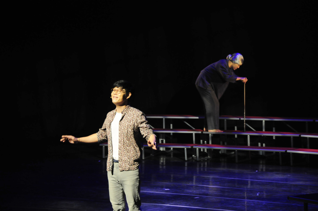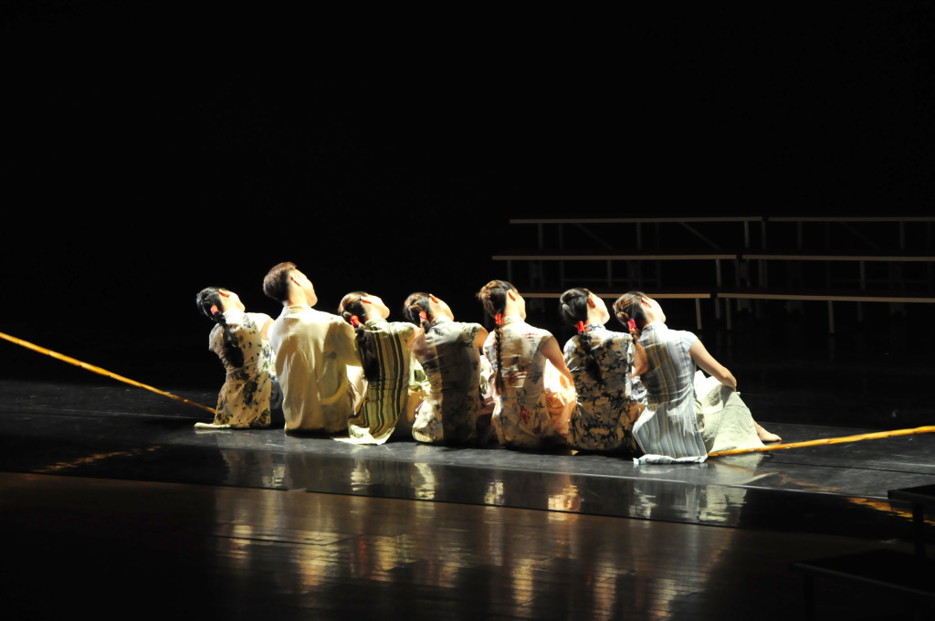 由六位女舞者一位男舞者,以及搭配全場演出的男歌手,八個人共同呈現了《台灣阿嬤》這整場的演出。《阿嬤》一開始已經揭曉了這個演出背景的時空,不知在場的觀眾記憶中阿嬤的形象和一開始在舞台上出現時的畫面會相當一致嗎?但是憨憨純純的男主角(歌手葉秉桓)已明講這是他的阿嬤的故事。