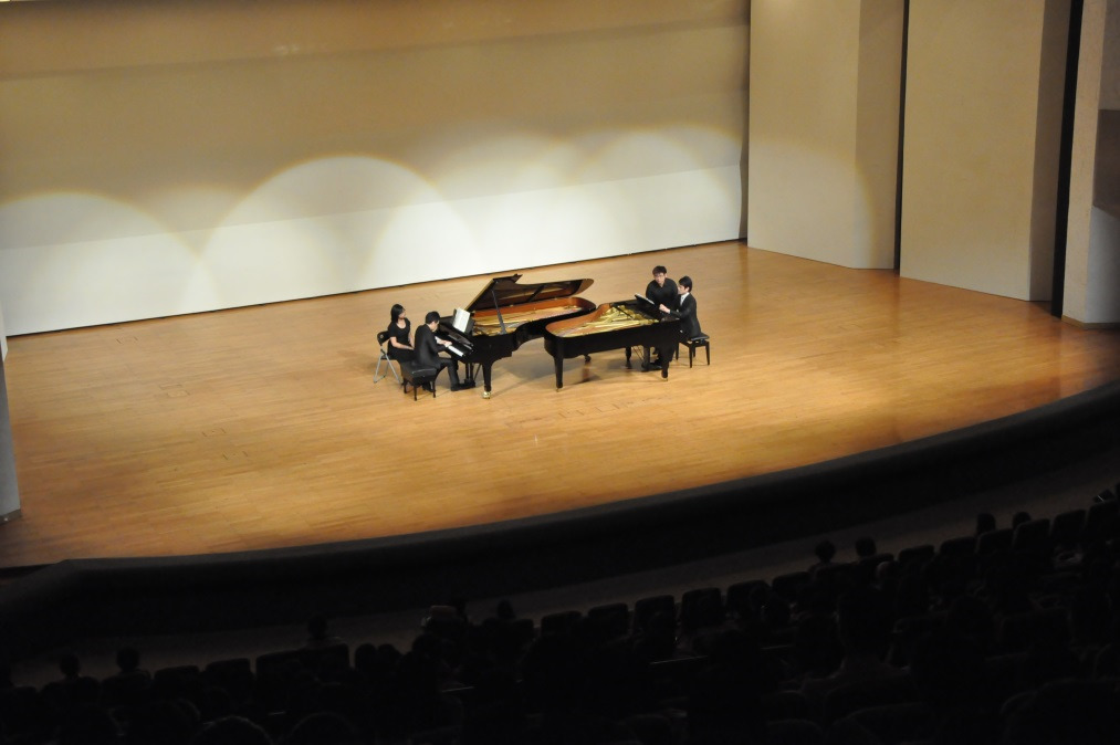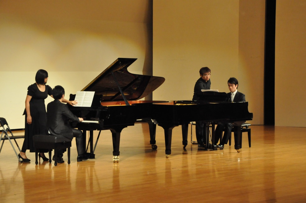 當晚音樂會中,二位傑出鋼琴家各自輪流擔任其中的第一鋼琴及第二鋼琴的部分,當然,無論在演出歷練及技巧詮釋上,明顯感受到陳冠宇老師高出一籌,他清晰亮麗扎實精準的觸鍵技巧及豐沛渾厚的力度,加上濃郁豐富的個人情感,以及渾然天成外放的肢體動作,幾乎是全場矚目的焦點;相較之下,安達朋博舞台的展現則顯害羞靦腆,猶如剛出道的新人,音樂上的表達也較纖柔夢幻。雖然他們只有短暫幾天的彩排練習,但兩人首次互別苗頭合作演出,默契已屬相當契合,全場樂曲的整體表現(不論彈奏技巧的拿捏或對音樂詮釋的新鮮想法)皆極具說服力,令人留下深刻的印象,激賞不已,對前往聆賞的愛樂者們真是一個超值的選擇。唯一缺憾是當晚兩架演奏琴的音律並不整齊,以致鋼琴家們在彈奏時的觸鍵及音色上的體現無法全然發揮到極致,甚為可惜,希望在此能喚起相關單位的注意。(註:爾後文化局遇有雙鋼琴演出,將知會調音師特別注意兩架鋼琴的協調性,並已著手編列預算安排兩架鋼琴的大整修)