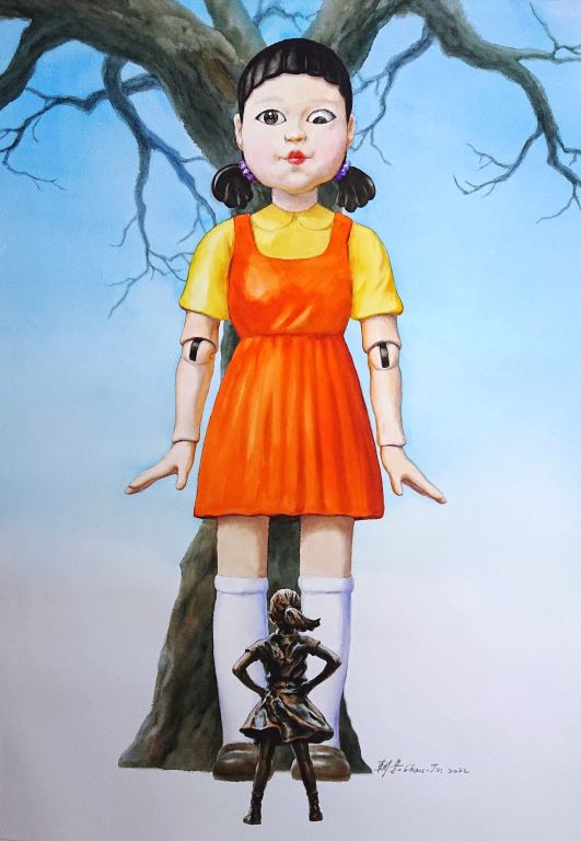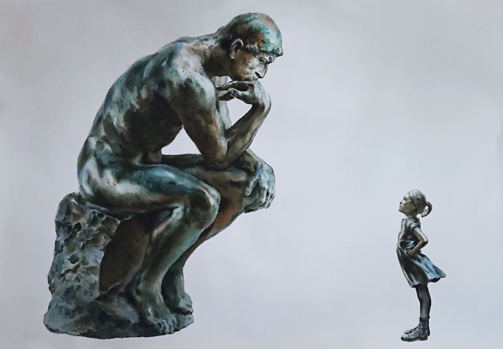 「是像非像」系列創作,是胡朝景教授近年創作的成果展現。展出作品均以平面繪畫為創作手法,將雕像作為創作對象,亦即以繪畫再現既有的雕像,所以「是像」。然而,當立體雕像被平面繪畫重現之後,雕像已不再是它原來的表象,所以「非像」。作者藉由畫筆重現雕像時,乃試圖對雕像進行重新詮釋,令觀者的意念在「是像」與「非像」之間游移,所見「是像」,亦為「非像」。而或許「是像」只是虛擬,「非像」才是真相。