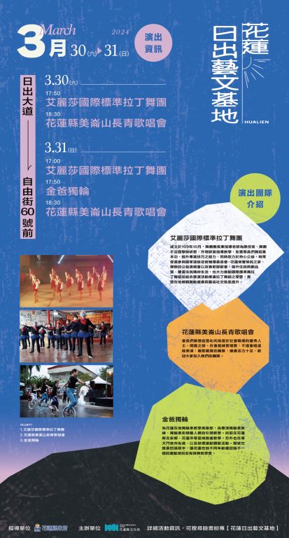 ⛅️花蓮日出藝文基地 🆕演出活動資訊🆕 3/30(六) 17:50 ❗️艾麗莎國際標準拉丁舞團 18:30 ❗️花蓮縣美崙山長青歌唱會 3/31(日) 17:00 ❗️艾麗莎國際標準拉丁舞團 17:50 ❗️金爸獨輪 18:30 ❗️花蓮縣美崙山長青歌唱會 演出地點:日出藝文基地(自由街60號) 歡迎前來觀看精彩的表演💗 活動照片