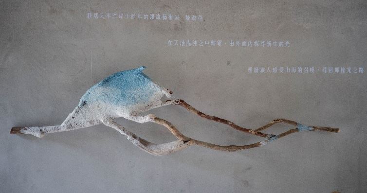 用充滿生命故事的漂流木線條勾勒出東海岸寫意風景,或台灣島嶼的叢山峻嶺。甚或是潛泳深海的古代生物,充滿有機的生命力!構樹的樹皮堅韌而溫柔,肌理細緻又粗曠,如雲朵或皮膜一般輕盈,攀附在漂流木上,一起創造柔軟如母親的大地身軀。
