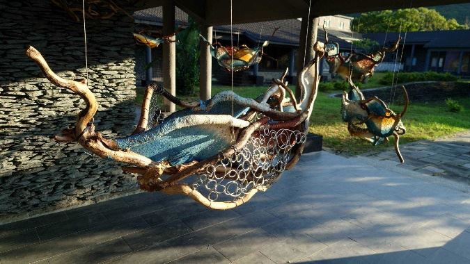 漂流木與構樹及金屬編織,以自信舒適的姿態重新組合相遇,詩意地訴說著有大地肌理的生命故事。