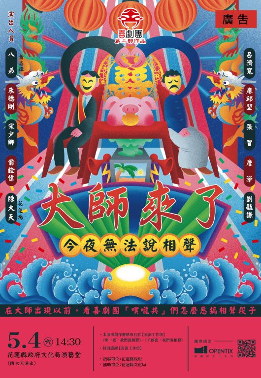 來自桃園,只演喜劇的現代劇團「喜劇團」將於5月4日在花蓮縣政府文化局演藝廳演出《今夜無法說相聲之大師來了》,此次結合相聲、漫才、脫口秀等喜劇形式,結合過去歌廳秀的元素,帶來與以往不同的相聲表演。