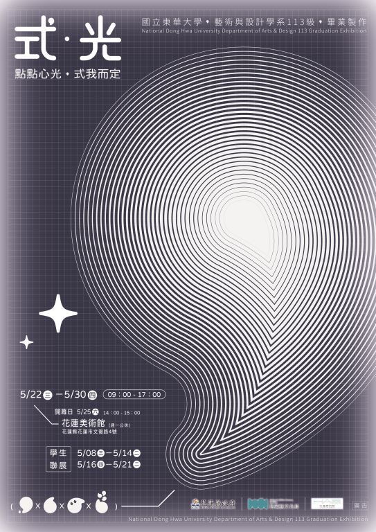 國立東華大學藝術與設計學系113級畢業展《式・光》113年4月底甫於新北市藝文中心展出,接著113年5月8日起移師花蓮美術館展出,展期至5月30日(週四)止,並於5月25日(週六)下午2時於花蓮美術館開幕,歡迎蒞臨參觀。