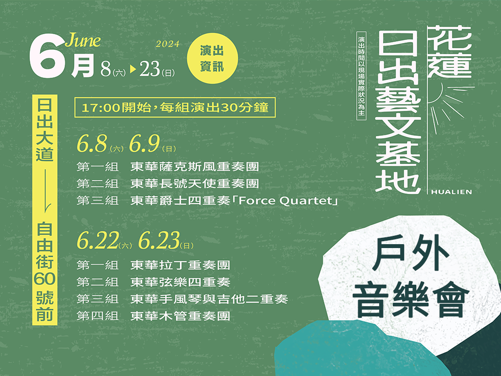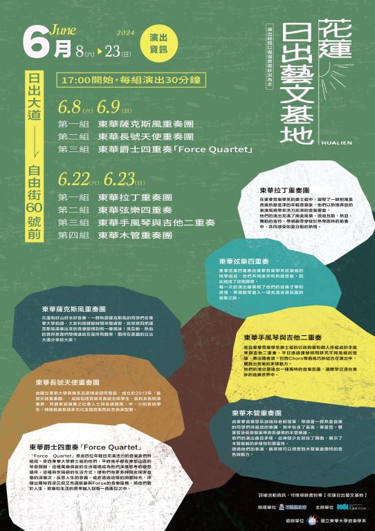 花蓮有好山好水好音樂,一群熱愛薩克斯風的同學們在東華大學相遇,大家利用課餘時間辛勤練習,就想將四把薩克斯風演奏出來的音樂變得別有一番風味!高互動、熱血的音符是我們想傳達給在座所有聽眾,期待在美麗的日出大道分享給大家!