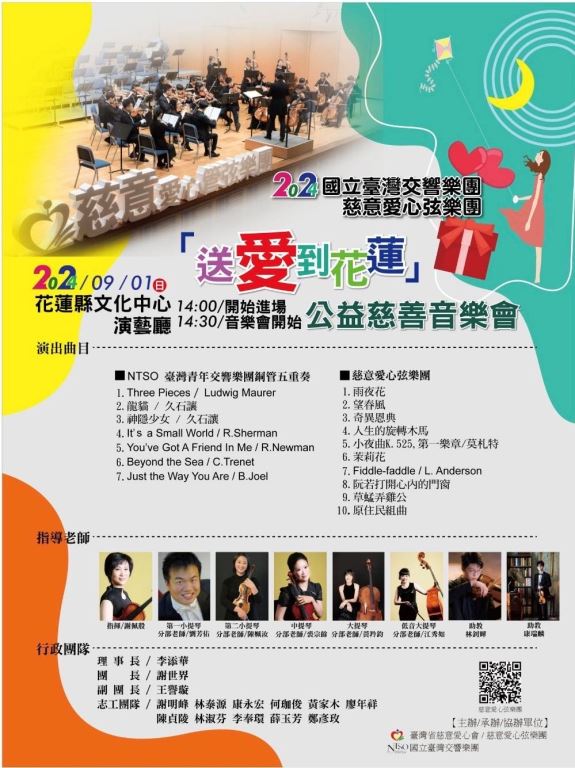 慈意愛心管弦樂團與國立臺灣交響樂團樂團指揮, 穿插演出經典及通俗的弦樂室內樂改編作品,由NTSO臺灣管樂團銅管五重奏演奏風格迴異的經典銅管重奏作品。為振興花蓮文化觀光產業,慈意愛心管弦樂團將邀請中彰投地區11所國民小學共同前進花蓮,感受依山傍海的壯闊景致、體驗原民文化及縱谷文明交融之藝文氣息,為東部地區的藝文發展共同貢獻心力。