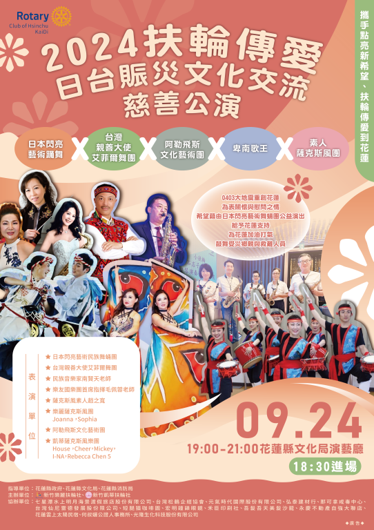 新竹市樂麗扶輪社為慰勞0403花蓮大地震期間執行人命救援之消防人員、災民救助、災後復原重建之縣府各局處同仁的辛勞暨慰撫飽受地震驚嚇之花蓮縣民,特別安排日本閃亮藝術民族舞蛹團等多組演出,邀請大家一同欣賞。