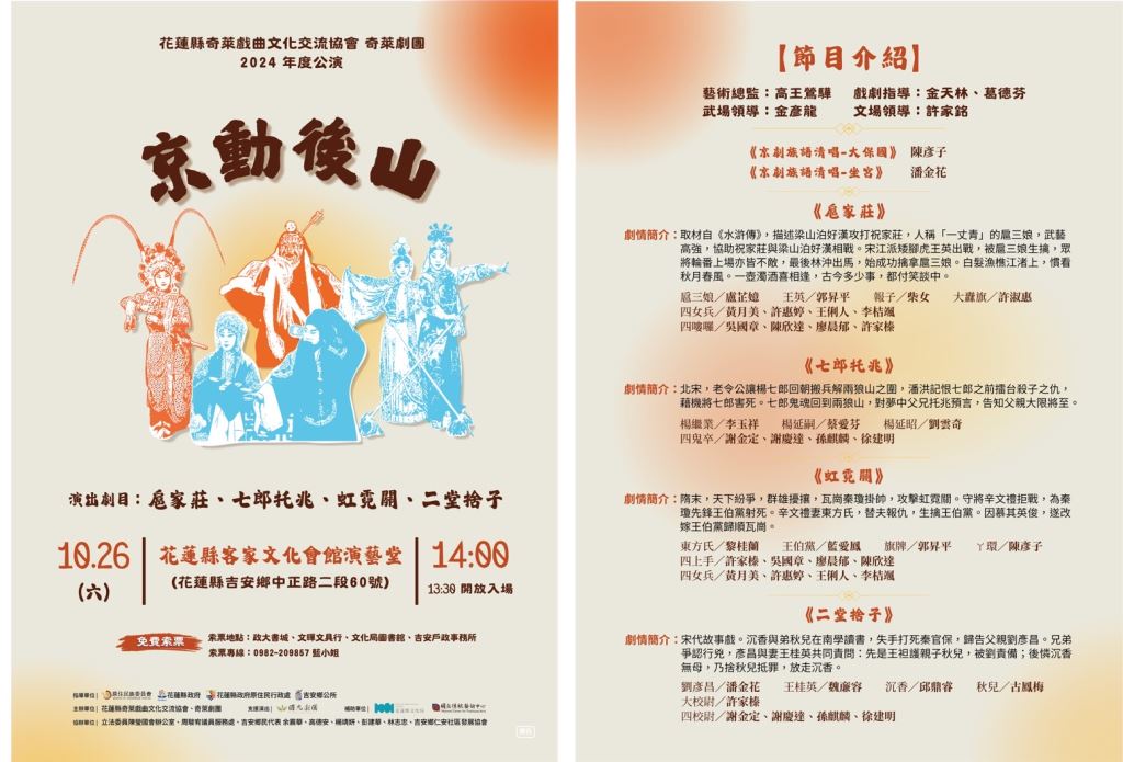 奇萊劇團今年要呈現給各位觀衆的劇目有展現高強武藝的「扈家莊」,由坐科台灣戲曲學院的新秀盧芷嬑演繹生擒梁山好漢的扈三娘;另一齣精彩打戲「虹霓關」則由奇萊「舞台情侶」(猜猜是哪兩位?)搭檔,看看古人奇妙的愛情戲!