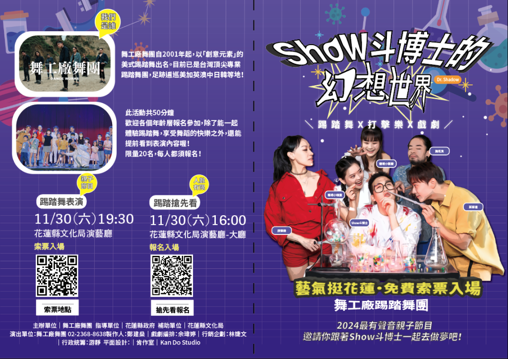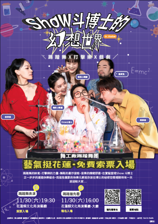 《Show 斗博士的幻想世界》以四種媒材作為生成快樂的燃料——踢踏舞的帥氣、打擊樂的力量、舞蹈的曼妙姿態、音樂的療癒舒適,在實驗室裡 Show 斗博士正一步步的建造快樂組合,而這些重要的快樂元素就存放在博士的秘密空間裡,期待有一天放送給大家……