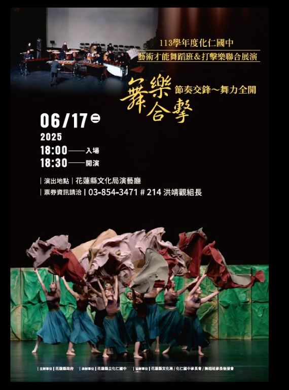 今年特別邀請化仁國中實力堅強、屢獲佳績的打擊樂團隊共同演出,讓力與美的節奏交織舞蹈張力,打造一場視覺與聽覺雙重震撼的藝術盛宴。這不僅是成果發表,更是一場跨界創新的藝術展演──節奏與舞步的激烈交鋒,熱情與汗水的真摯揮灑,讓你一秒入戲,全程屏息!