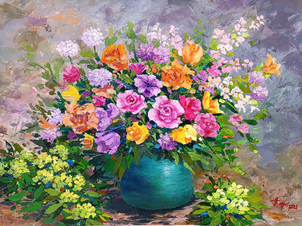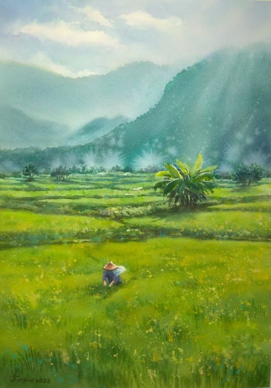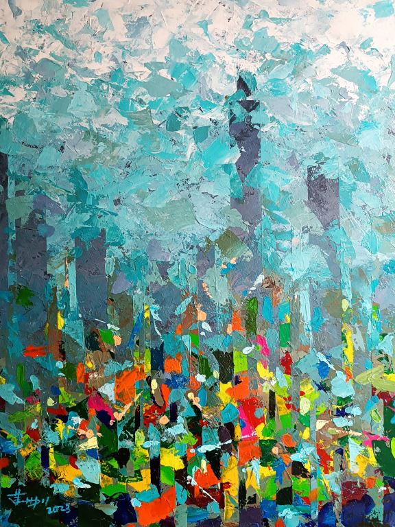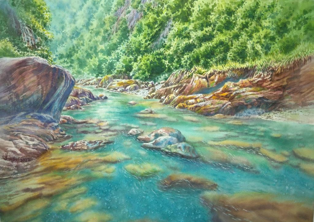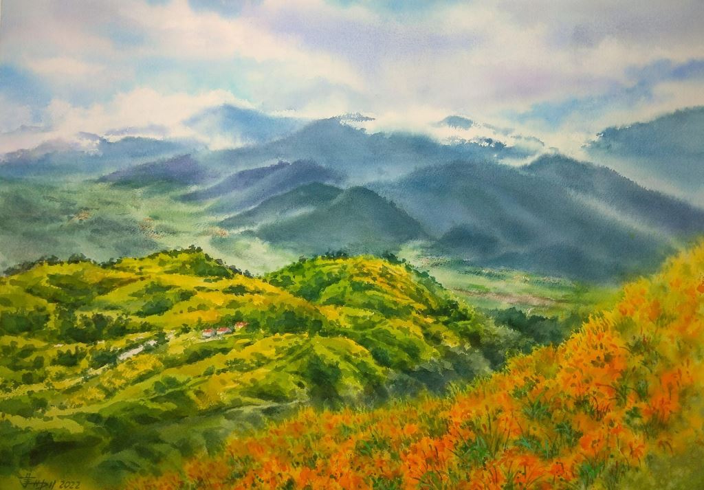 蔚藍天空下,與家人好友一起走過的路,值得回味一輩子,當它成為畫作,就變成與觀眾分享的橋樑。作品除表達內心的意念與主觀意識外,畫作亦喚起觀眾的共鳴;驅動觀者為嚮往已久的景緻,付出行動力。在疫後新的生活,每個人應做好防護,走出戶外,享受大自然,強化身心靈健康,為自己的人生妝點豐富的色彩。