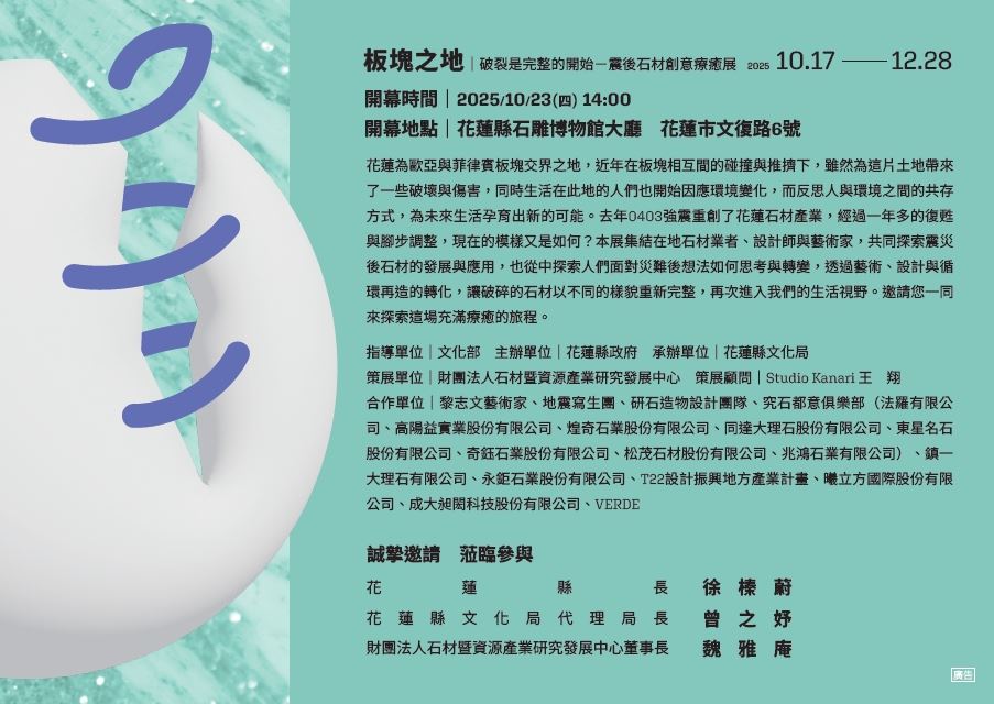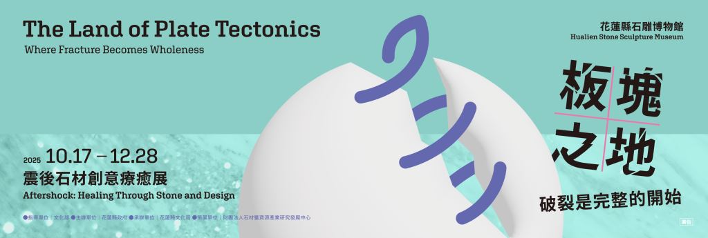 《板塊之地-破裂是完整的開始》震後石材創意療癒展於 2025 年 10 月 17 日至 12 月 28 日於花蓮縣石雕博物館登場!由文化部指導、花蓮縣政府主辦、花蓮縣文化局承辦、財團法人石材暨資源產業研究發展中心策畫,以「破裂即新生」為核心概念,集結藝術家、設計師與在地石材業者,透過藝術、設計與科技等多重面向,探討震後花蓮石材產業的再生與重構,帶領你我穿越震動,讓風景在破碎間重生,展現生命持續延展的力量。