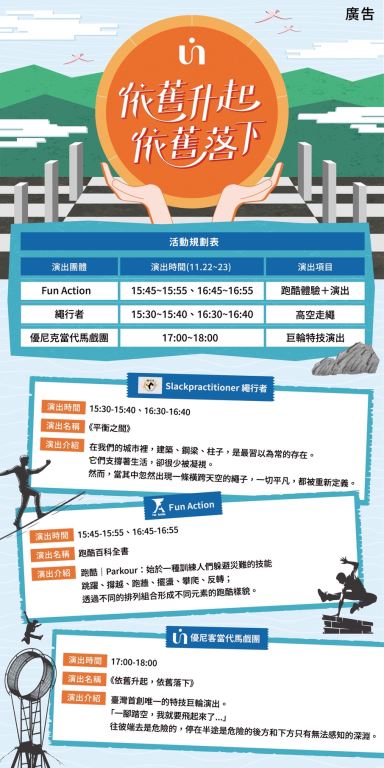 跑酷演出: 《跑酷百科全書》15:45-15:55 、《蹦床籃球》16:45-16:55