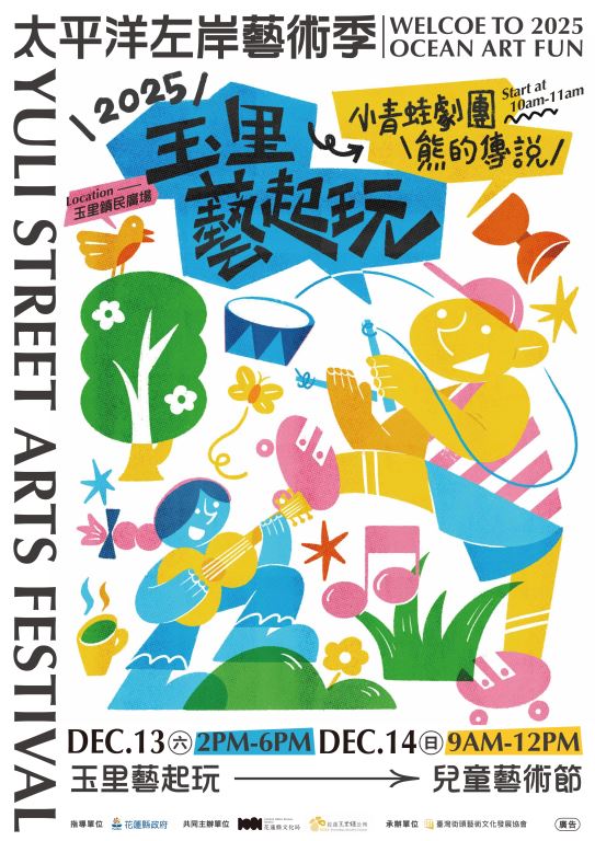原訂 9 月 27 日、28 日舉辦的《2025玉里藝起玩》及《2025兒童藝術節》活動,因颱風影響交通受阻,確定延期至 2025 年 12 月 13 日(六)至 12 月 14 日(日) 辦理。誠摯邀請大家在年末再次相聚玉里,一同用藝術點亮小鎮,讓想像力無限綻放!