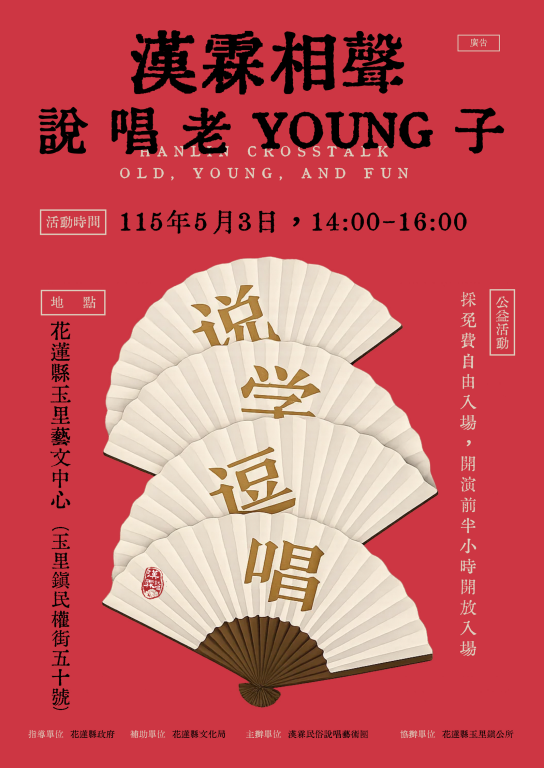 適合親子共賞的精彩內容,讓大小朋友都能在歡笑中親近文化、啟發想像。《說、唱 、老Young子》誠摯邀請您一同走進劇場,感受笑聲背後的智慧與溫度,共享一場充滿人情味與藝術魅力的文化饗宴!