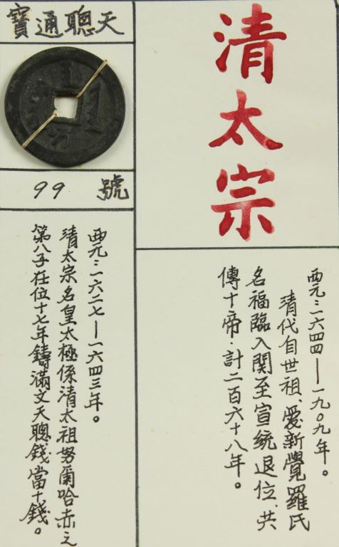西元1627至1643年。清太宗鑄滿文「天聰通寶」當十錢。