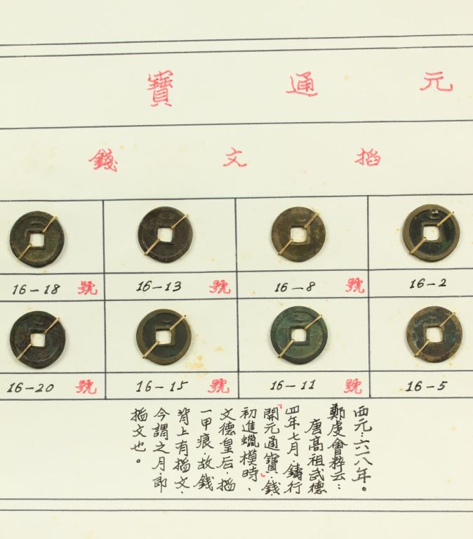 作品資訊 作者 唐代(後周三枚) 類別 民族古幣 尺寸 2.2*2.2 cm 八枚 作品介紹 西元六一八年,鄭虔會粹云:唐高祖武德四年七月,鑄行開元通寶錢,初進蠟模時,文德皇后,掐一甲痕,故錢背上有掐文,今謂之月郎掐文也。