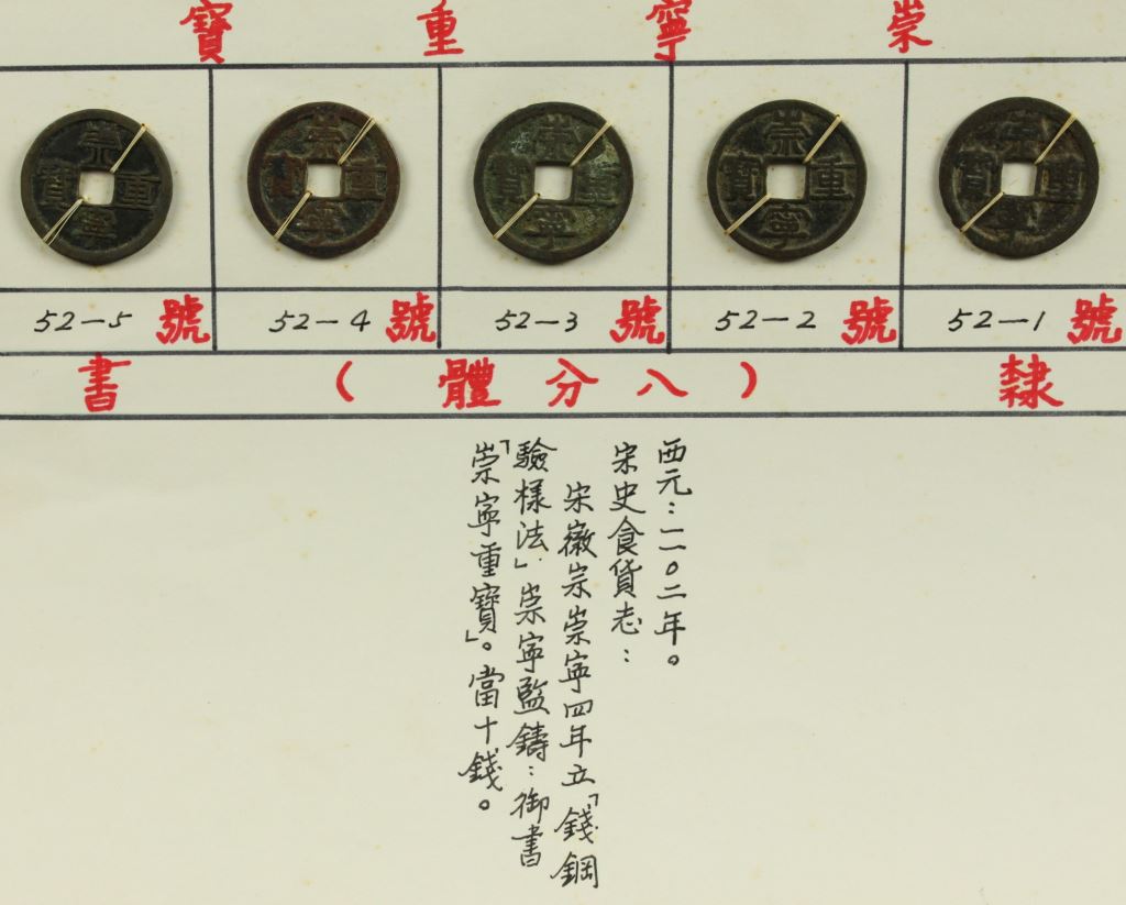 西元1102年。宋食貨志:宋徽宗崇寧四年立「錢鋼驗樣法」,崇寧監鑄:御書「崇寧重寶」。當十錢。