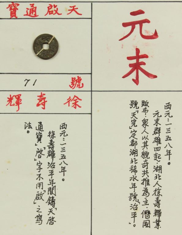 西元1358年,徐壽輝治平年間鑄「天啓通寶」。