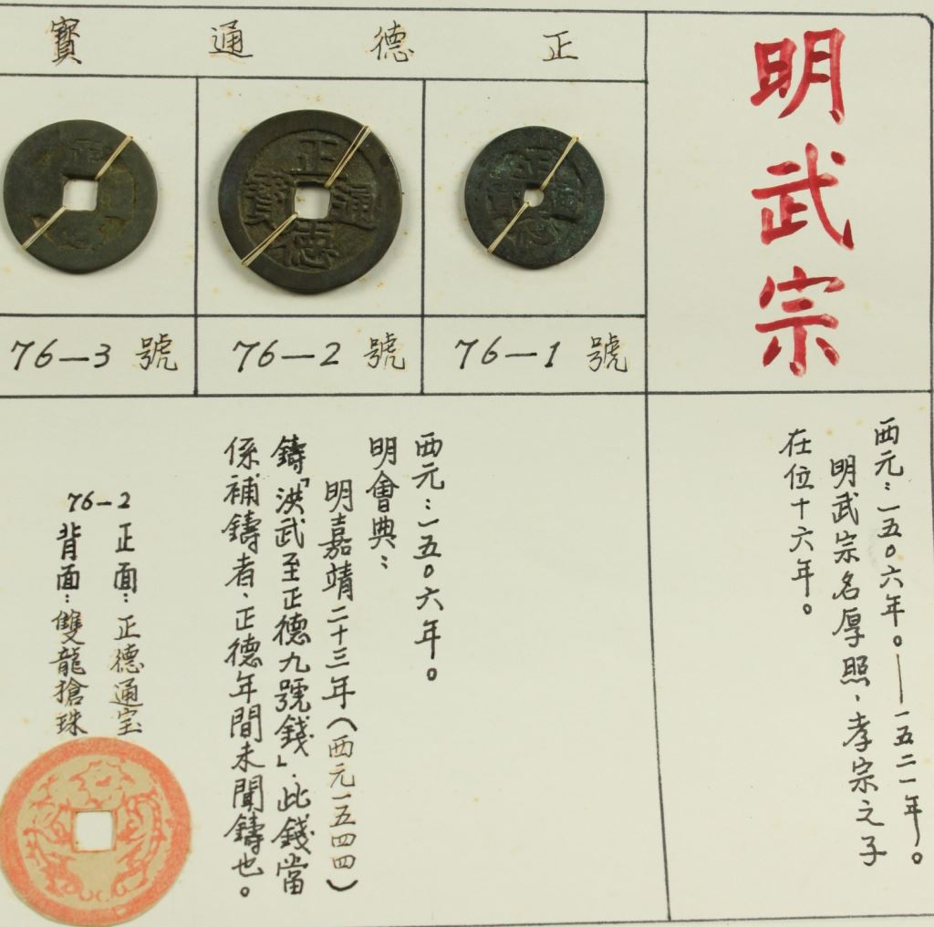 作品資訊 作者 明代 類別 民族古幣 尺寸 76-1:2.7*2.7 cm 76-2:3.7*3.7 cm 76-3:3*3 cm 三枚 作品介紹 西元1506年。明會典:明嘉靖23年(西元1544)鑄「洪武至正德九號錢」,此錢當係補鑄者,正德年間未聞鑄也。
