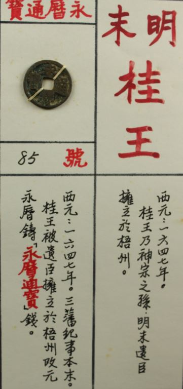 西元1647年。三藩紀事本末。桂王被遺臣擁立於梧州改元永曆鑄「永曆通寶」錢。