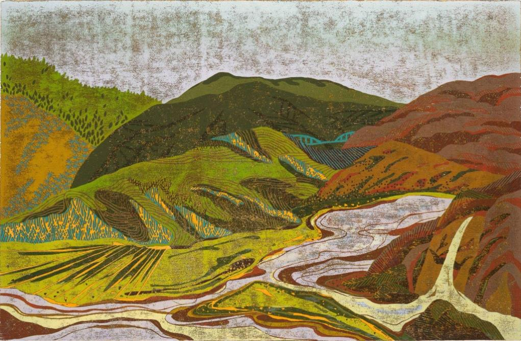 作品資訊 作者 李育貞 類別 西畫 尺寸 91*66 材質 油印木凸版,金粉,紙本 作品介紹 長期關注環境議題,但不以「寫生」的方式創作,畫面也不見得單指一個地方;利用版畫重複刻版、疊印的特性,將人造物移除,營造並恢復一個看似「自然完美」的狀態,將屬於自然裡的樹林、生態都「移回」原處,甚至填補被開挖砍頭的山坡地,試圖藉由創造出的「風景」來表達對現實的期望,並提醒觀者那些因人類活動而消失的自然。