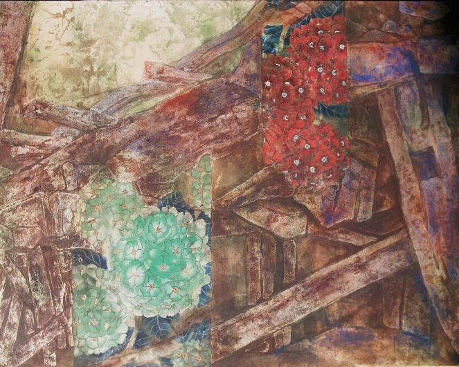 作品資訊 作者 王令 類別 西畫 尺寸 72*91 材質 銀箔、礦物顏料、皮紙 創作自述 創作方向雖選用膠彩媒材卻不同於傳統的膠彩創作題材,內容多以花蓮在地文化,例如:林田山廢棄鐵道,及具有花蓮特色花卉,及原住民風格顏色,期望能讓大眾關注花蓮文化歷史傳承的重要性。呈現手法則加入當代怪奇與流變的原素,畫面嘗試解構光影與視覺,使畫作既具有花蓮文化特色又具有創新的新奇趣味。類光影符號在畫面中的舞動更是讓觀者能在一個畫面中取得數種觀看效果。