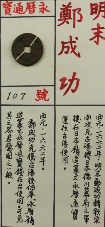 西元1662年。鄭成功克復台灣後仍奉「永曆」鑄造篆文永曆通寶錢在台使用。
