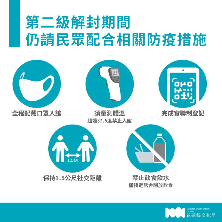 觀眾入館時,請確實遵守各項防疫措施,配戴口罩、測量體溫、實聯制登記(發送簡訊1922或紙本登記)、嚴禁飲食,並配合保持社交距離以及館方之人流管制措施。