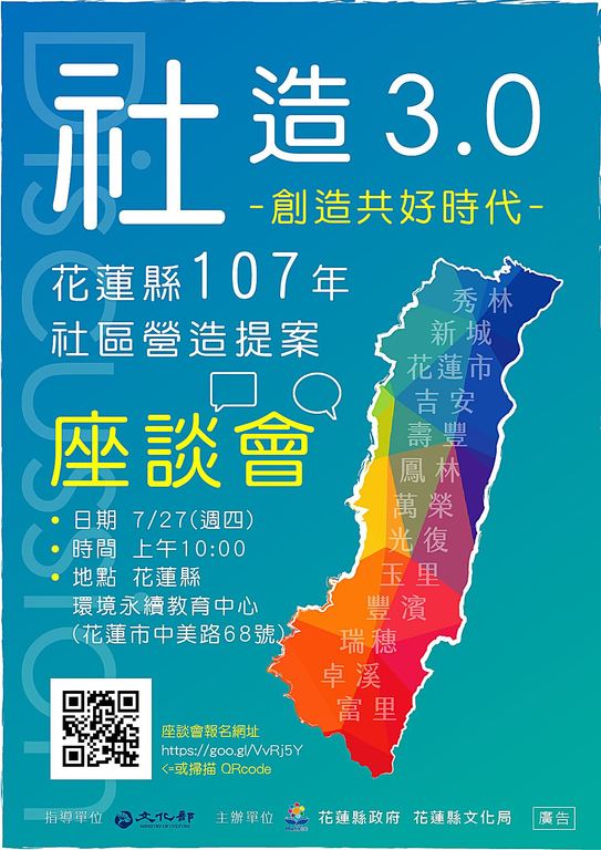 社區營造走過23年, 感謝所有鄉親的熱情參與。 誠摯邀請各位社區工作者及關心社區發展的朋友們, 一同來分享你對花蓮社區營造政策的期待及建議。 您的參與及建議是我們進步的動力~^^~ 主辦單位:花蓮縣文化局 活動日期:106年7月27日(週四)10:00 活動地點:花蓮縣環境教育中心(花蓮市中美路68號) 報名網址:https://goo.gl/VvRj5Y 相關連結 報名網址 新聞照片