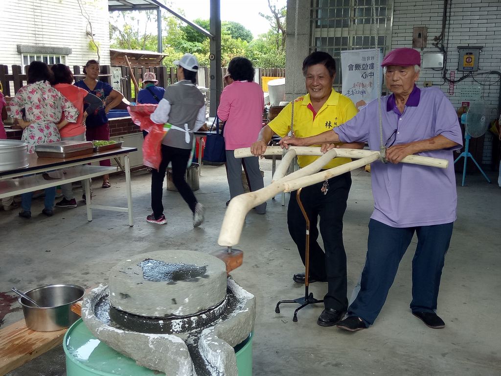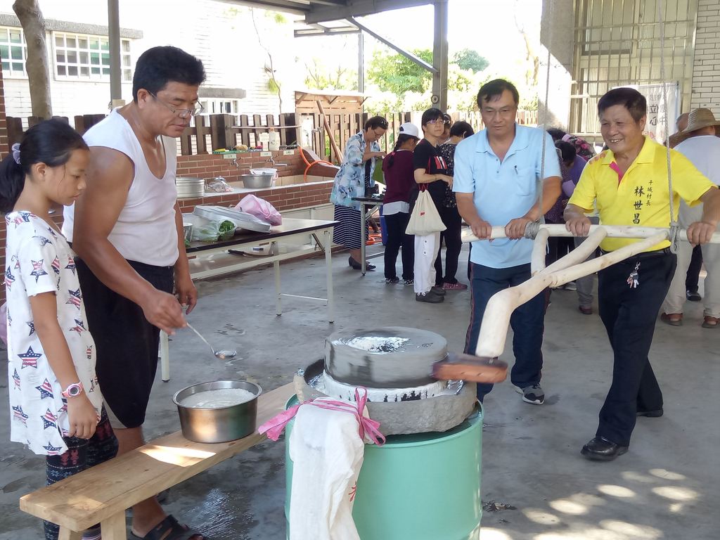 現場最吸睛的莫過於傳統石磨米漿體驗,林世昌村長為備一個石磨多方打聽,終於在村民倉庫裡找到廢棄已久的石磨,經村長跟木工村民一同修復好相關木製零件,石磨再度重生受寵,現場甚至排隊體驗拉石磨的樂趣,老少、夫妻同心協力拉動石磨,有經驗的長者熱心的在旁說要逆時針,腳要前後站才好施力,推不動就順便拉一把,歡笑聲中充滿感動,散發濃濃古早味與傳承意義。