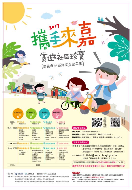 為推動嘉義市社區深度文化之旅,本局特別邀請社區協會與民間團體,共同策劃了「攜手來嘉.賞遊社區珍寶」之社區深度之旅活動,訂於106年11月18、19、25及26日4日辦理悠活客庄行、生態樂活行、工藝美學行、鐵道鐵馬行等4個主題行程。期待在深度遊程當中,民眾可以認識嘉義這小而美的城市、認識每一個社區精心呈現的「社區珍寶」,親手參與社區特色DIY活動,及品嚐社區精心製作的社區美食。竭誠歡迎全國民眾一同來趟嘉義市的深度之旅,體驗嘉義市的人文與熱情。 詳細內容請參見官網(http://www.cabcy.gov.tw/web/)或來電洽詢05-2788225分機808,方小姐。 附件檔案 活動簡章(.docx) 相關連結 活動網址 新聞照片