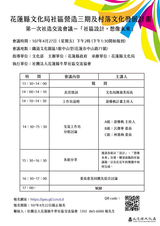 為促進社區彼此間的交流與互動,並在社區營造實務工作上彼此分享經驗、攜手合作,舉辦本年度第一場次社造交流會議。主題「社區設計,想像未來」,以「透過設計解決問題」的概念出發,邀請社區分享彼此面臨的困境,如何透過社區營造的計畫解決,在解決的當下,對於社區的未來又是如何想像。以此聚焦討論,經驗交流。 歡迎大家踴躍參加~^^~ 時間:107年4月27日(星期五)下午2時 地點:鐵道文化園區1館中山堂(花蓮市中山路71號) 報名網址:https://goo.gl/zznzLd 報名期限:107年4月22日 聯絡人:社團法人花蓮縣牛犁社區交流協會 (03)865-6000 楊先生 檢附議程表及活動海報供參。 附件檔案 議程表(.docx) 新聞照片