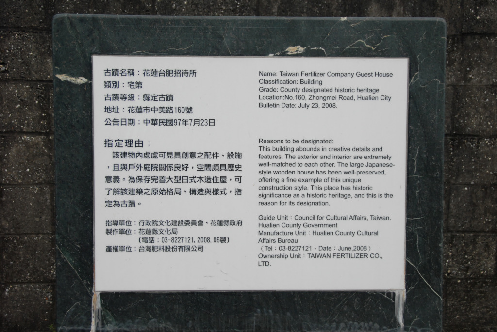 花蓮臺肥招待所位於花蓮市中美路,臺灣肥料股份有限公司花蓮廠前身為日本アルミニウム(鋁)株式會社花蓮港工場,於昭和13年(1938)左右進行工廠改建及擴廠的建設,當時為了提供總公司長官及工程人員抵花蓮時有個休息之處,於是於米崙地區規畫了兩處有如旅館似的招待會所,也就是中美路上的臺肥招待所及招待所旁的另處佔地較小的招待所,可惜位於今招待所右側的招待所多年前慘遭祝融燒毀。目前僅存的臺肥招待所約在昭和12年至13年間(1937-1938)所建,戰後,部分房舍由臺肥公司所接收,由公司高階長官居住,民國97年進行國有眷舍清理的政策下,臺肥所屬的宿舍皆被拆除並進行拍賣,僅剩下臺肥招待所被保存了下來。招待所內處處可見具創意之配件、設施,且與戶外庭院關係良好,空間頗具歷史意義。臺肥招待所建築屬於完善之大型日式木造住屋,從中可了解該建築之原始格局、構造與樣式。