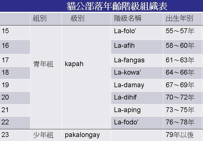 (一)登錄理由:Fakong(貓公)部落仍保有傳統年齡階級與相關祭儀、禁忌,對於頭目傳承及其名字,亦能清楚瞭解。