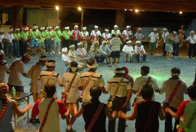 5、由主祭團領唱迎靈祭歌,人員起立圍成圓圈隨音律舞蹈,領唱團依序從年齡高的年齡階級開始,傳遞下一階接替傳唱,直到lofang最後一階結束。
