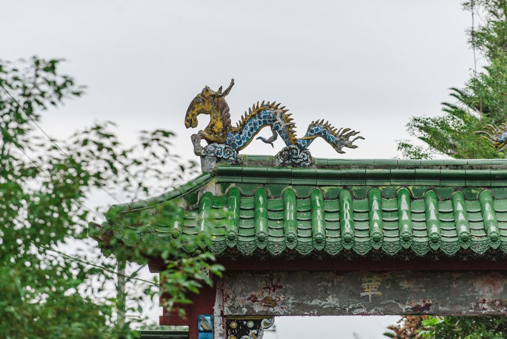 光華農場的牌樓主體採三間四柱三樓式,屋簷形式為單檐廡殿頂,上覆綠色琉璃瓦,琉璃瓦上左右各有一條「馬頭龍尾」造型的塑像,似乎代表著「龍馬精神」的象徵,牌樓柱體採朱紅色,也因年久失修的關係,顯得有些斑駁。左右兩間則立有一面仿贔屭造型的石碑,石碑上頭刻寫著「光華墾區記」及「參加開墾人員芳名錄」,不過此兩座石碑也因歲月的摧殘,石碑上的文字已模糊成了無字天書,隨著榮民的凋零及住戶的遷移,此牌樓也因無人維護與管理的情況下,色澤已不復當年,牌樓表面的油漆顯得相當的斑駁不堪。