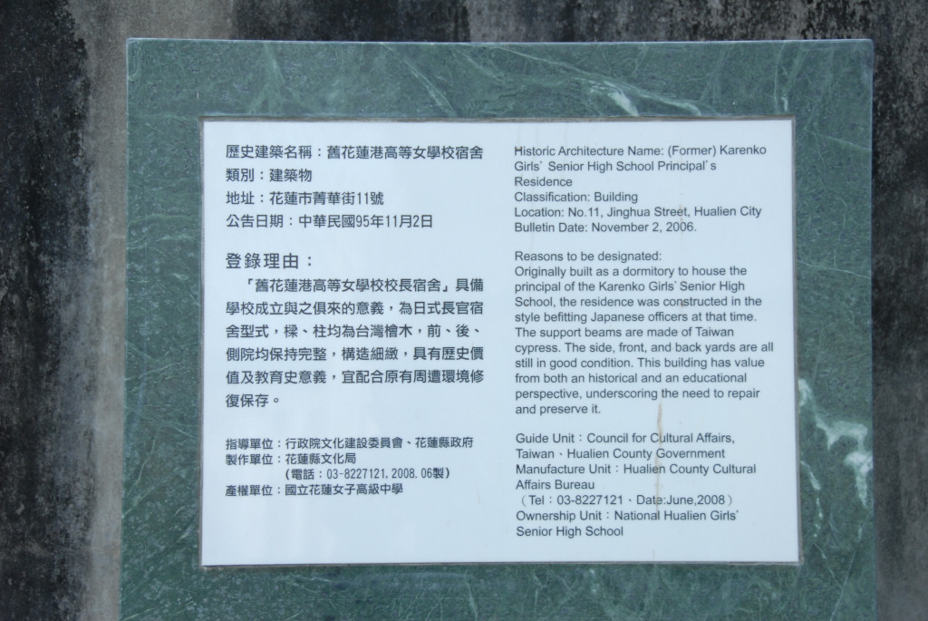花蓮港高等女學校校長宿舍為日式木造宿舍,全棟使用檜木建材,格局為傳統日式房屋配置,外牆則使用雨淋板設計,此設計除了可防雨外,還有隔溫的功效,是日本人在明治維新時代由北美洲引進的工法;屋頂形式也特別,具有時代意義。