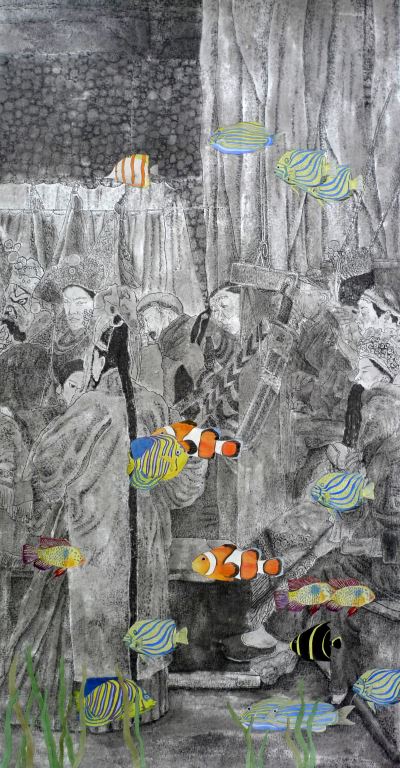得獎資訊 得獎年度 2011 類別 國畫 作品資訊 作者 張雅淳 尺寸 95*175cm 材質 墨彩 作品賞析 本件以水墨畫加彩為媒材,以戲台為背景,上置熱帶魚以暗示主題。戲台內粉墨角色,形色各異,作者以輕雅的點線描繪,淡墨施染,形成巧妙空間。熱帶魚悠遊於戲棚角色間,豐富了畫面的活潑性。結構穩健,筆墨圓熟,是一件富矛盾對比且能統調的成熟作品。 評審:耿李重重、黃永川、李秀華