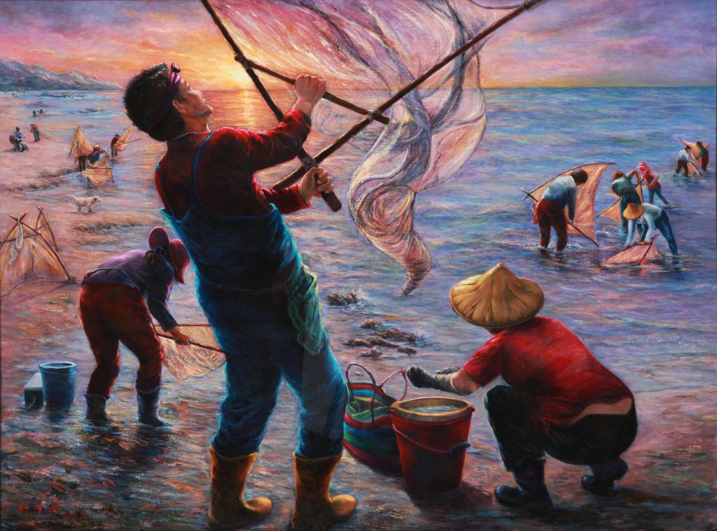 畫中表現討海人生活在岸邊以網網魚的人們、集收貝類的大嬸、以竹網取魚的年輕人及以斜陽為背景的遠方人們,是一幅海上生活的寫照。人物生動、寫景實際,堪為成功的表現。