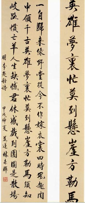 得獎資訊 得獎年度 1995 類別 書法篆刻 作品資訊 作者 林森輝 尺寸 42*178cm 材質 墨、宣紙 作品賞析 作者用楷行書名人李楚舫七律,用筆如行雲流水,用墨厚重踏實,尤其用米黃絹書寫,更能表現出晉唐趣味,整幅觀之一氣呵成,表現出行書之明快流利之感。唯款「明李楚舫」較低,若能再提高高二、三字當更好,用印稍大(最好不要大於款字),雖有小瑕,但瑕不掩瑜。