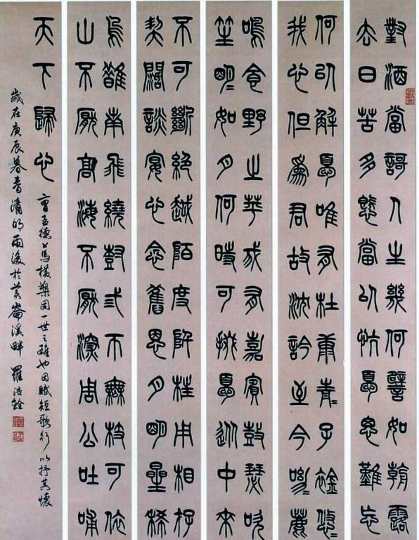 篆書六屏『曹孟德短歌行』,用筆穩健,結構端嚴優雅,佈局勻當。
