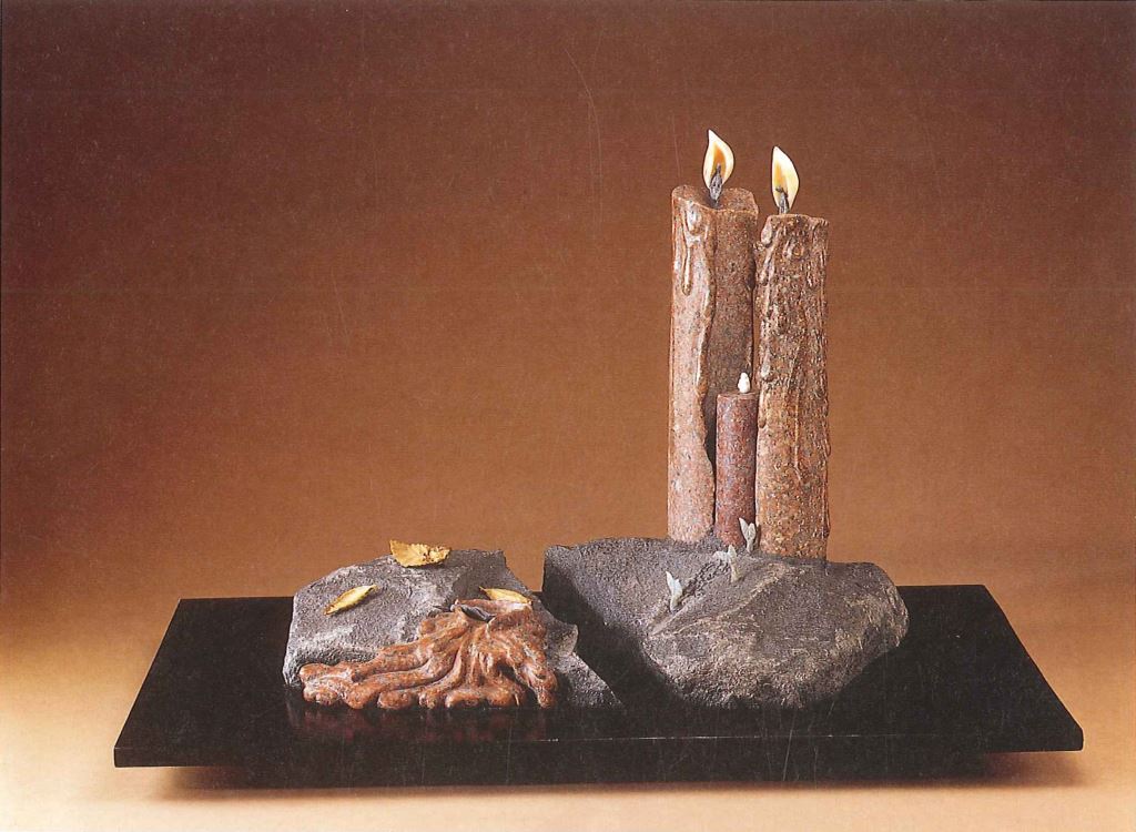 得獎資訊 得獎年度 2002 類別 雕塑 作品資訊 作者 林仁德 尺寸 82*48*48cm 材質 花崗石 作品賞析 作品以自然分裂為二的花崗石材,呈現人生如大地板塊分合無常,蠟炬造型傳達了燃燒自己照亮新生的施獻精神。幾片凋葉一如人生史詩在生命的世代中消蝕燃盡。 整體作品給予人的省思甚為深切,多種石材雕作技法布局醇熟,搭配詮釋恰如其分,經評審結果,在洄瀾獎雕塑類為最高分。 評審:林樹德