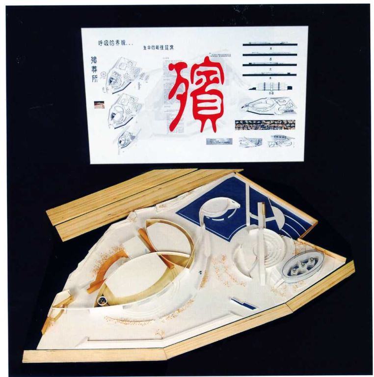 能把冷漠、恐懼、不願面對的殯儀館用現代感的幾何圖形手法設計成既樸實、莊嚴而又讓人覺得有溫馨的公共場所,是這件作品最成功的地方。 從平面圖、立面圖、俯視圖等建築工程設計圖到模型製作都相當精緻,是件優秀作品。 評審:楊英鏢、蔡平陽 這件作品在幾何的造型,以及設計過程確實較費心力,不失一件富有想像力的作品。 模型製作在建材的選用,綠地的配置,動線的安排,建築物的使用等方面均無明確的交代,僅使用「紙」製作的模型,難以詮釋原創的動機與目的。 評審:霍鵬程