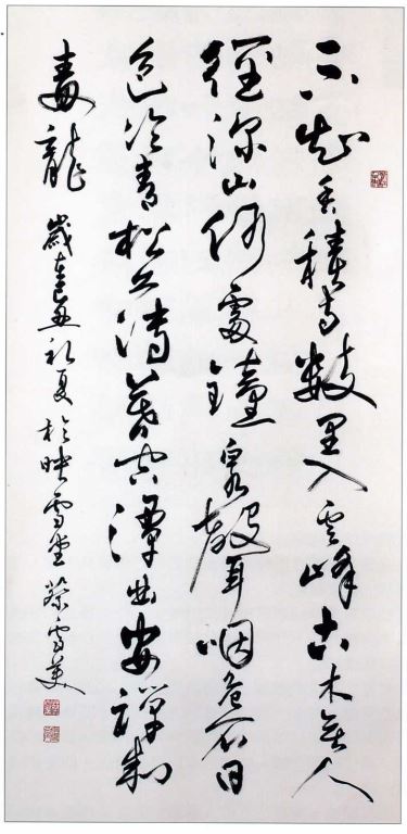 書法是文字的造型藝術,主要在表現文字的美感,以及筆墨線條和留白空間的造型情趣。雖然只有單純文字的點畫組合,仍要在筆墨行跡中,表現作者的情意胸懷與美感趣味。而成功的創作,除了深厚的功力基底外,創意內涵、畫面構成、表現技巧,以及個人風格的表現力與作品展現的感染力,更是必要條件,這也是藝術創作的究竟理想,當然這也成為此次美展評審的主要觀點。 此次洄瀾獎作品是以行草書寫唐代詩人王維的《過香積寺》。此作用筆方面,精準多樣的用筆技法與鋒勢變化,成功的使點畫線條表現出豐富精采的趣味。結構章法方面,上幅作品字裡行間