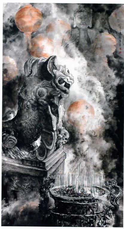 得獎資訊 得獎年度 2009 類別 國畫 作品資訊 作者 彭秀蘭 尺寸 180*90cm 材質 墨彩 作品賞析 畫面以石獅為主,作者以俯視、平視、仰視三個不同角度描繪,貫穿全幅。雖鈎勒線條較少,然尚稱平穩。通幅水墨韻染為多,僅於燈籠以淺朱色微染托襯,與線香末端朱色相呼應,運用得宜,惟全幅過於強調水墨渲染,弱化線條表現,若在線條鈎畫方面加強,當有助提昇畫面精神。 評審:許郭璜、林秀菊、林永利