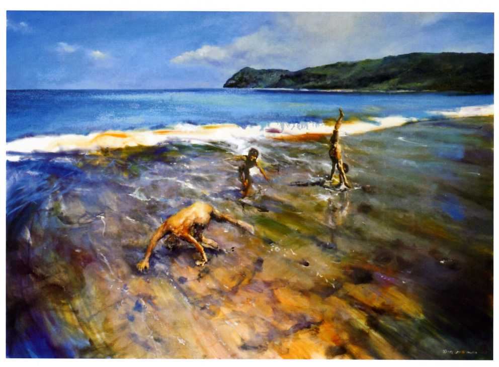 得獎資訊 得獎年度 2010 類別 西畫 作品資訊 作者 侯文欽 尺寸 216*156cm 材質 水彩、紙 作品賞析 斜切畫面的浪花,技巧的將畫面分為兩個〝段落〞—寧靜的七星潭躺臥在陽光下,卻因風與三個活寶的參與,完全活過來!作者藉著相近的彩度,卻對比的明度表現出閃爍著陽光的身軀,以及衝向沙灘又退去的海水,以活潑、輕快、拖、拉、擦、揉的筆觸,顯出海水的動態與透明,是收放自如,有創意。 評審:黃秀玉