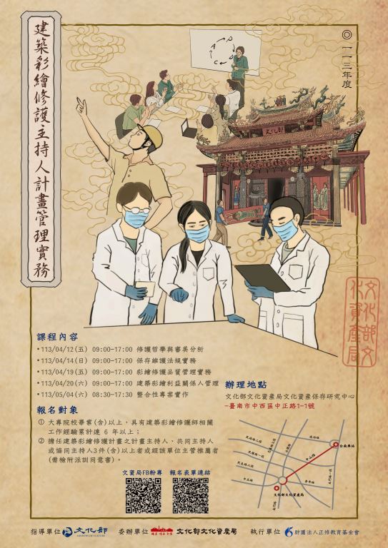 一、文化部文化資產局為提升修護品質、落實文化資產保存修護人才培育工作,培育產業所需之人才,辦理「建築彩繪修護主持人職能基準單元課程」及「文物修護職能課程師資培訓班」,期能強化現有建築彩繪修護主持人之關鍵職能,歡迎踴躍參加。