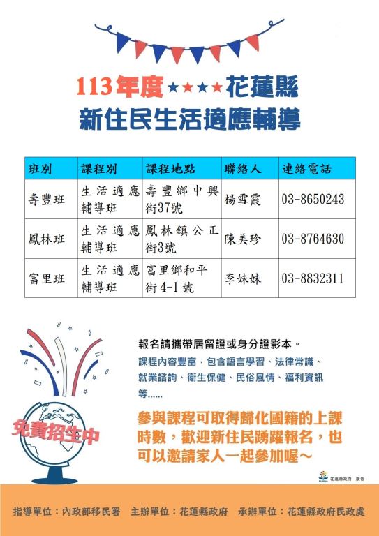 辦理地點:壽豐鄉豐山村豐山街43號 、鳳林鎮公正街3號、富里鄉和平街4-1號。