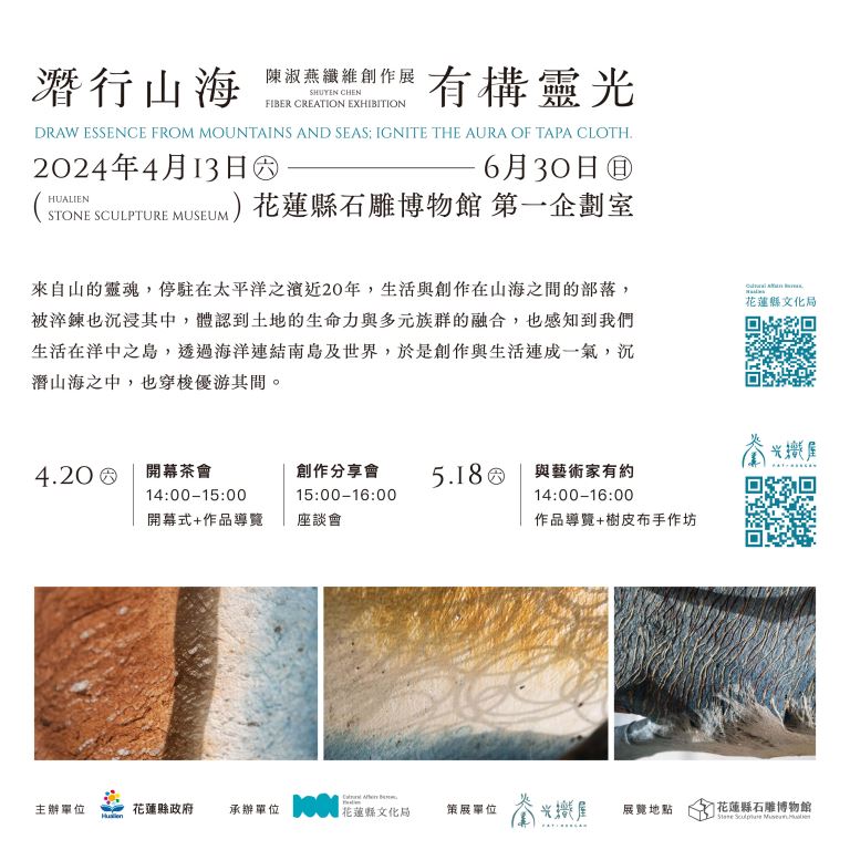 展覽簡述:台灣東部地處太平洋島弧及洋流帶,充滿活力的潮汐流吸收了山林、山谷中零散的樹木。從構樹樹皮布中,我們可以看到台灣島與世界的關係,這就是古老樹皮布的文化密碼。此次展覽邀請台東鹿野出生現居花蓮東海岸藝術家陳淑燕老師,2002年機緣樹皮布引領她打開纖維有機的創作,從<輕擊著 那回聲>、<穿越時空的囊袋>、<微光花樹>到這幾年<島舟之洋><在海之濱>等的作品,成為探向原始自然、古老時空和連結島嶼台灣的觸角和手,也探向人的內在底層,那神秘的、細緻的、透光的、純淨而晶瑩剔透,充滿未知與生命力的內在聖殿~並微微散發著光!